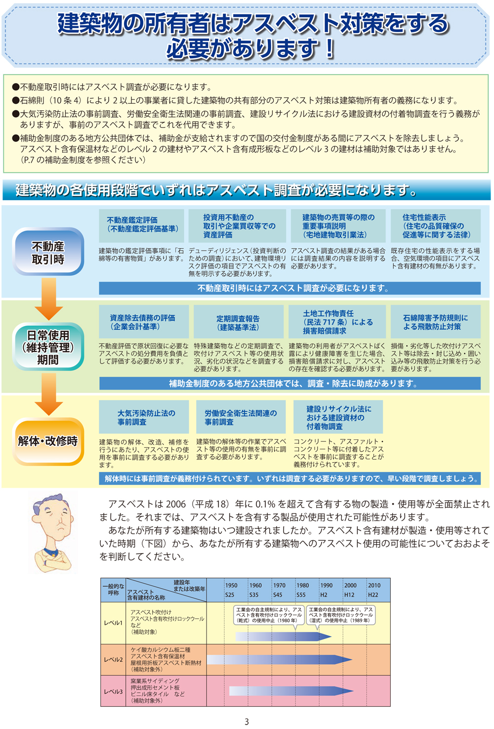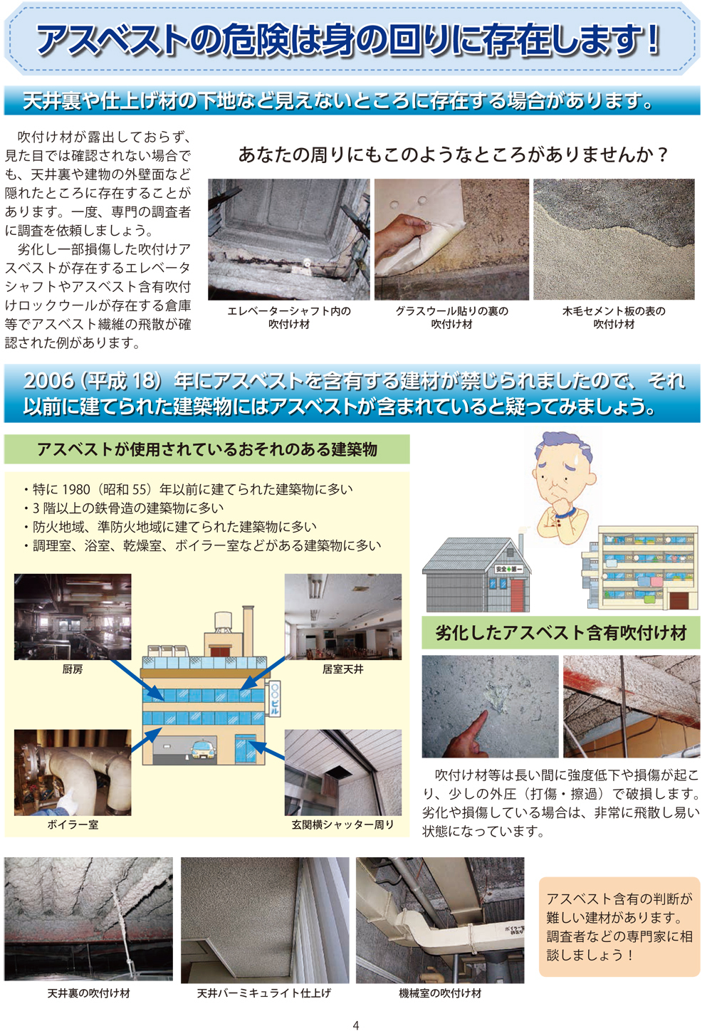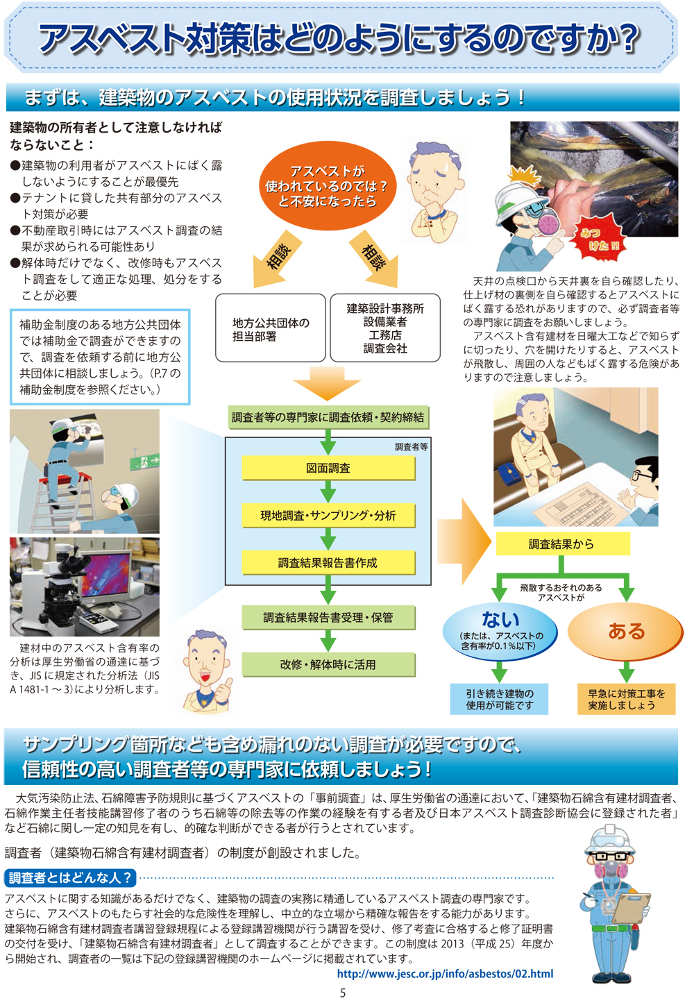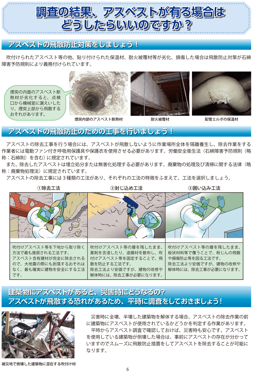アスベストの使用状況を調査します。アスベストにばく露しないように、ご自分で確認せず専門家にお任せください。調査の結果、飛散する恐れがある場合、対策まで行います。